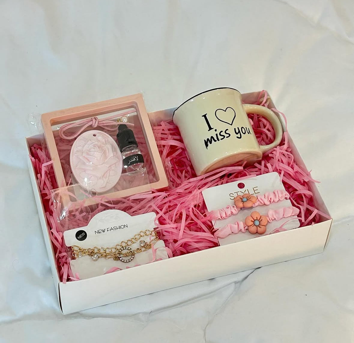 يحتوي على ( ربطات شعر ، عطر مع قاعدة عطرية ، سواره ، كوب )