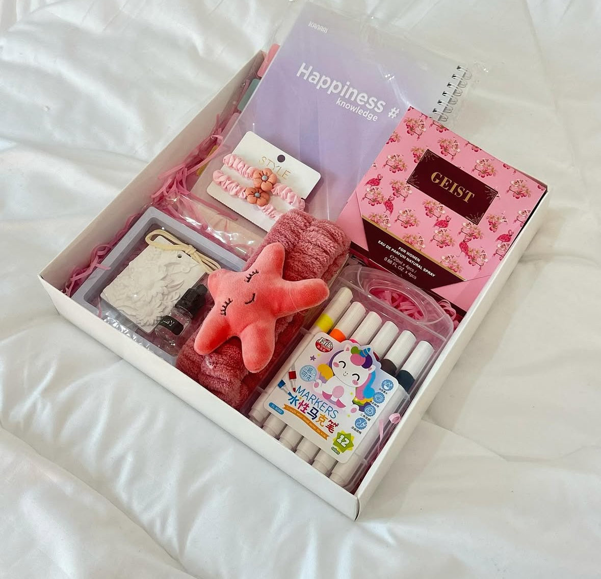 يحتوي على ( علبه عطور ، دفتر ، عطر مع قاعدة عطرية، طوق ، ألوان، ربطات الشعر)
